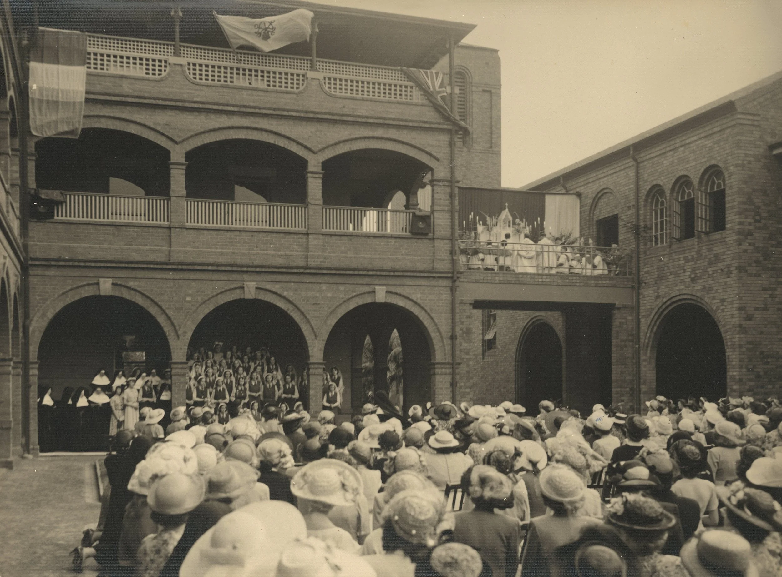 A Garden Party to celebrate the Diamond Jubilee concludes with Benediction. Sisters and students form the choir singing beautiful Latin motets. Stylishly hatted ex-students kneel on the grass for Benediction of the Blessed Sacrament to be given from the ‘bridge’ linking the Convent with the Chapel. The Papal flag flies above between the flags of Ireland and Australia. On the bridge the presiding clergy, flanked by altar boys, pray before the enthroned monstrance.